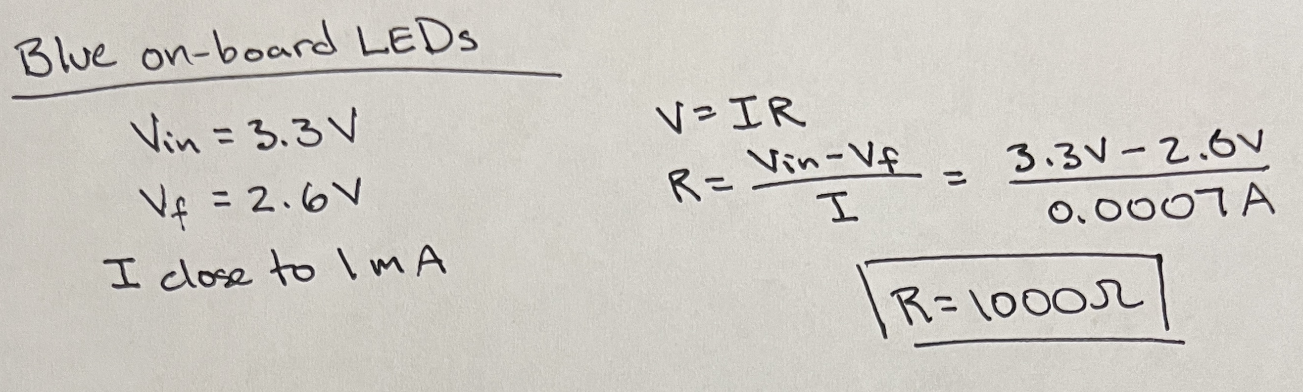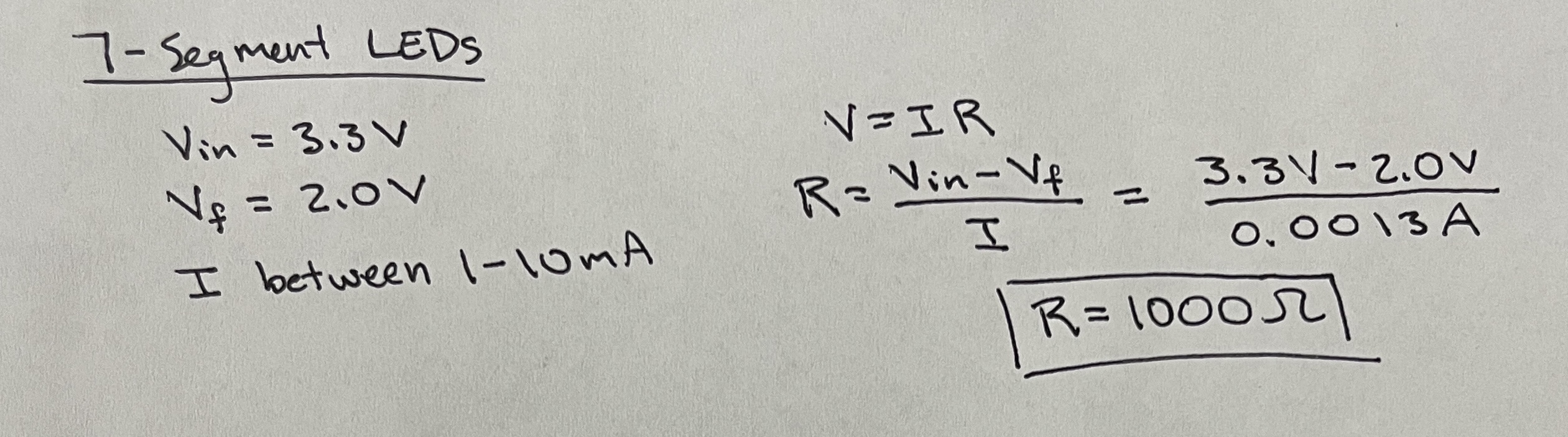 The LEDs illuminated on the development board during this lab were blue, indicating a forward voltage drop around 2.6 V. These diodes are high-efficiency, meaning they can glow at currents less than 1 mA. The deep red diodes on each segment of the seven-segment display exhibit a forward voltage drop of 2 V. Sufficient and safe illuminesence for those external LEDs can be obtained with a current ranging from 1-10 mA.