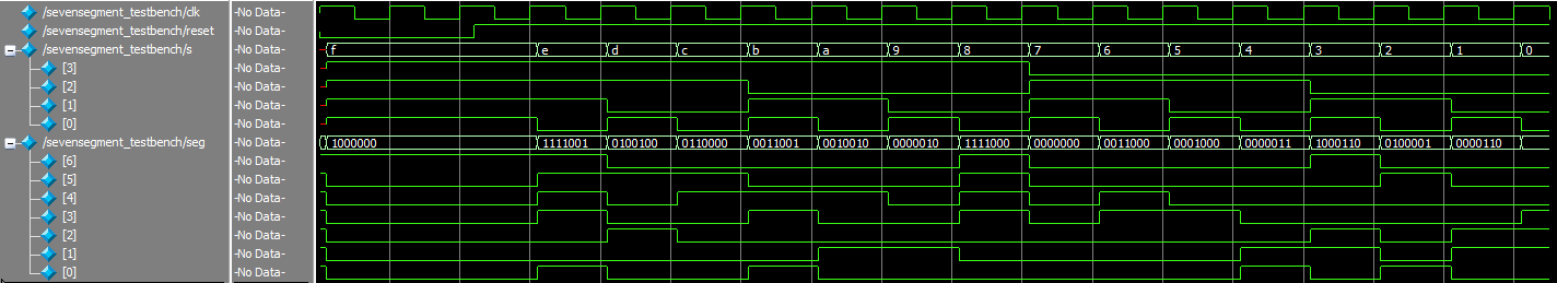 Figure 6 shows the waveforms generated from the seven-segment module simulation. These waveform simulations also appear in the top module simulation, but it is best to confirm that both modules work properly to aid in debugging combinational logic issues or implementation issues. Notice all segments demonstrate the desired behavior outlined in the test vectors.