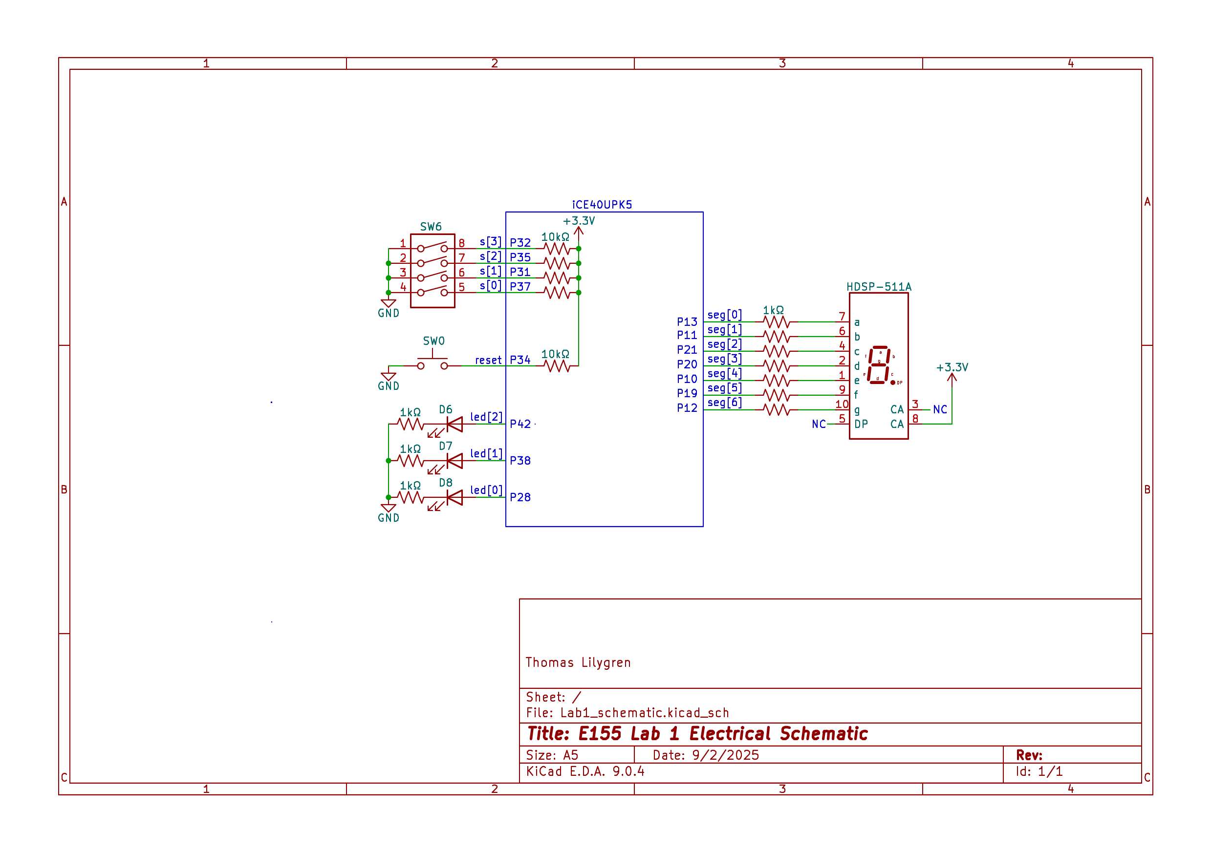 With an on-board switch panel linked to the UPduino 3.1 FPGA board, a SystemVerilog file implemented the conditional logic to illuminate two of the three LEDs. While the third LED operated independent of switch logic, its control was established using the built-in 48 MHz high-speed oscillator (HSOSC) from the iCE40 UltraPlus primitive library. A 24-bit counter was used to divide the 48 MHz clock cycle down to the desired 2.4 Hz. Further board GPIO testing was conducted by powering an HDSP-511A seven-segment display to uniquely display each hexadecimal digit (0-F). Segments were illuminated depending on the same switch element that governed the first two embedded LEDs, meaning the segment outputs relied solely on combinational logic. The hexadecimal digits displayed mirrored the binary combination that the switches displayed. To ensure uniform brightness, regardless of the number of segments powered, each pin on the display was wired in parallel with 1 kOhm resistors to limit current draw, as calculated in Figure 2.