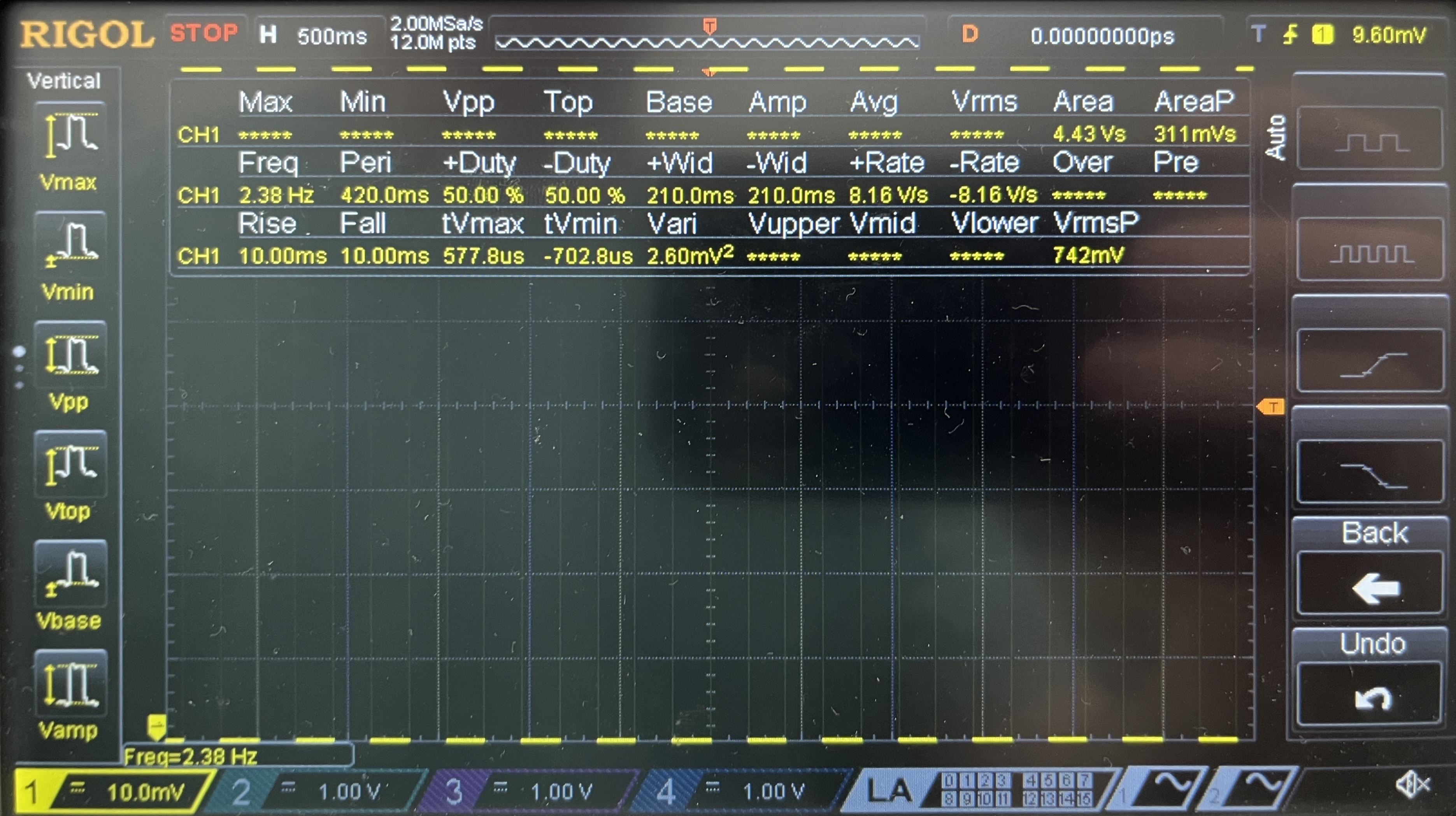 Figure 7 outlines the periodic square wave influenced by the oscillating LED. Using built-in functions on the oscilloscope, the frequency is measured to be 2.4 Hz, as desired.