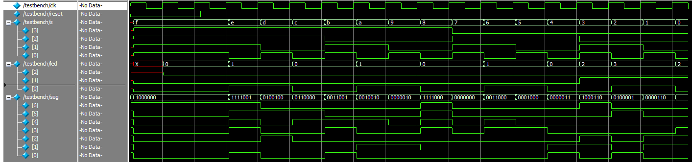 Figure 5 shows the waveforms from the top module. The first line shows the clock cycles, the second highlights the reset state, and the third describes the switch inputs. Notice the switch inputs contain all possible hexadecimal digits that should be displayed on the segments. Since led[2] oscillates at the same frequency regardless of the input values, that component was confirmed separately with the oscilloscope image in Figure 7.