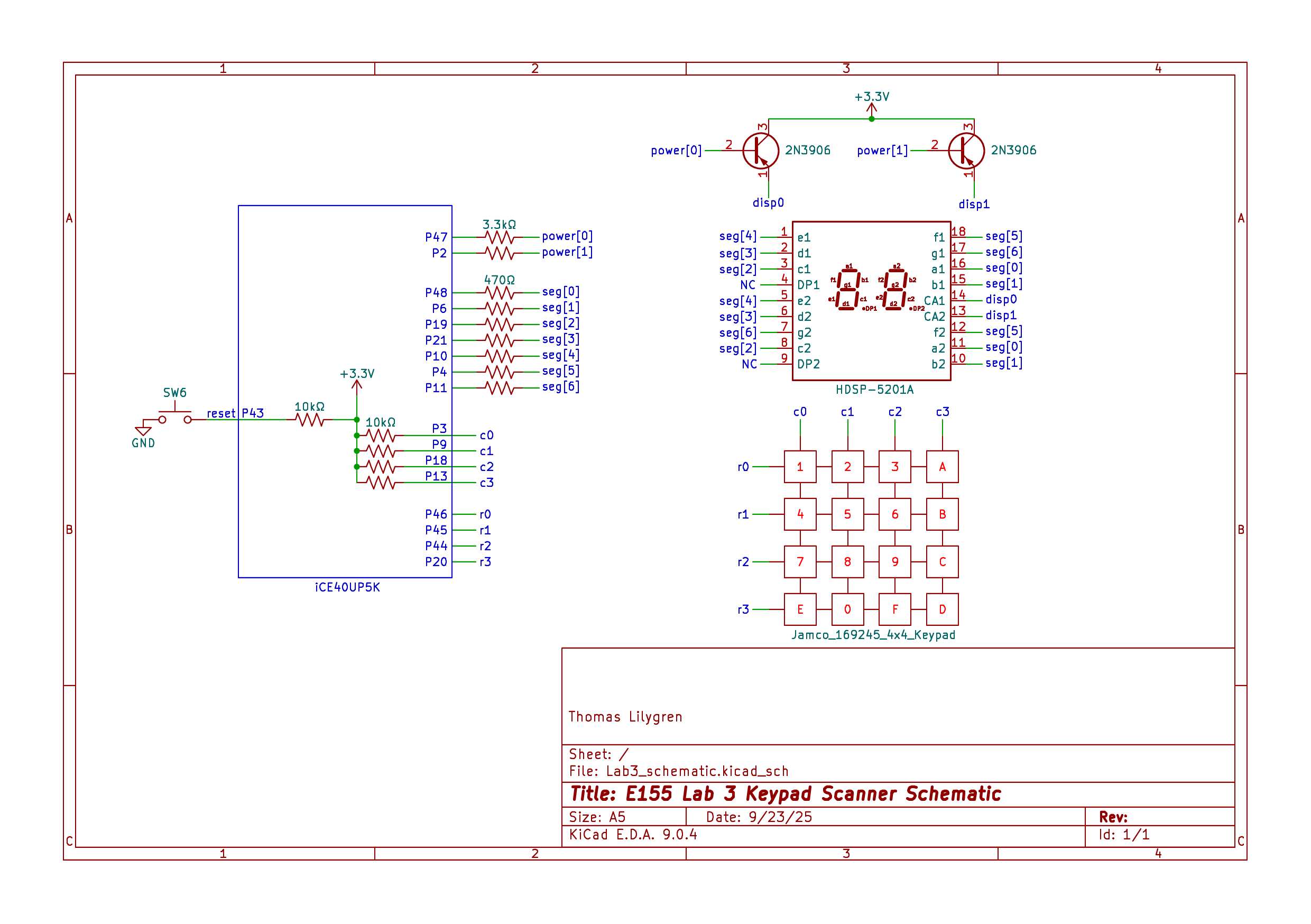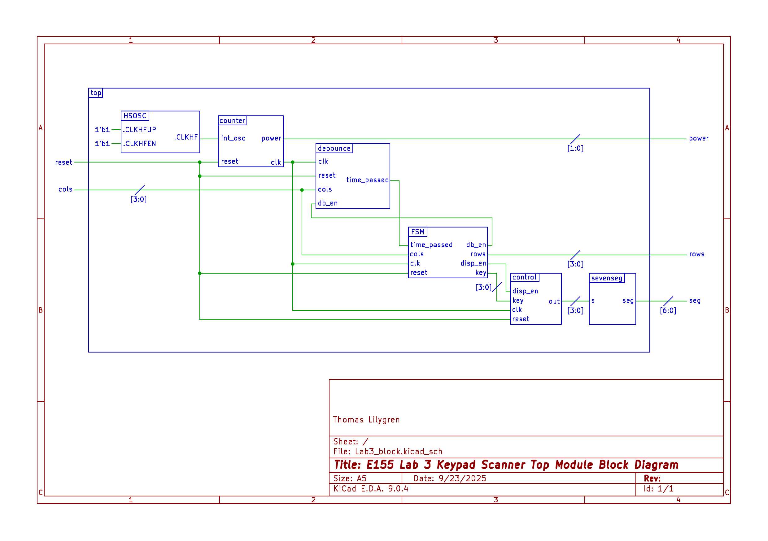 This lab proved to be moderately successful. Absent the synchronizing logic, the keypad successfully scans through all rows to generate the proper key value input. The 20 ms debounce logic requires the button to be pressed slightly longer for the output to fully register. While I could not properly implement the synchronization aspect of the lab, I believe that it is very possible to actually implement in the near future. The primary issue was that the synchronized columns would appear two clock cycles behind the rest of the logic, meaning the set row values would get stuck at specific values. By setting the rows high in one state, implementing a two-clock-cycle delay, and then scanning the synchronized columns, this issue could be solved as the rows and synchronized columns would follow the same timing. This would increase the duration for which the user must depress the button to ensure all necessary state register the button press to display the value.