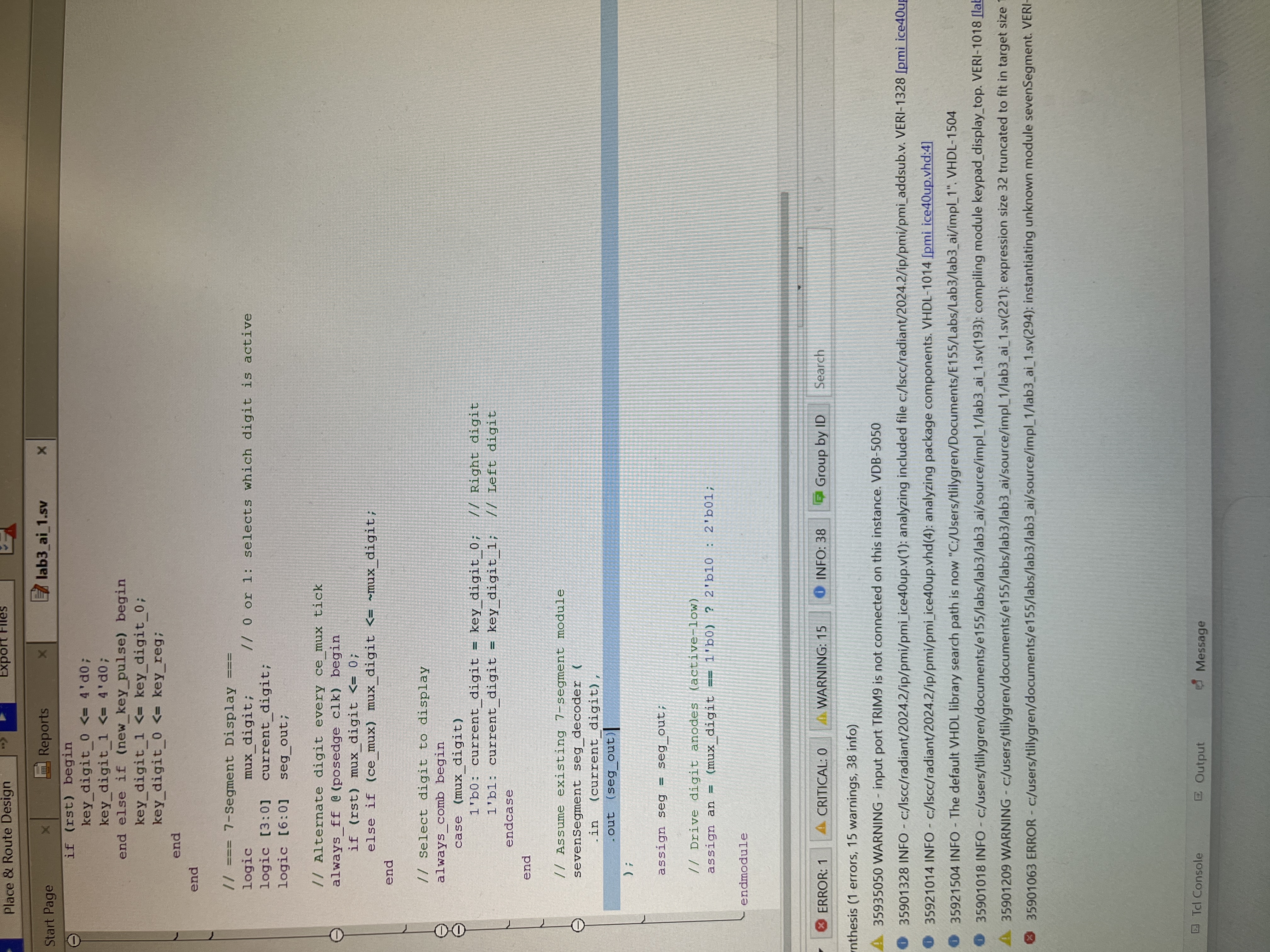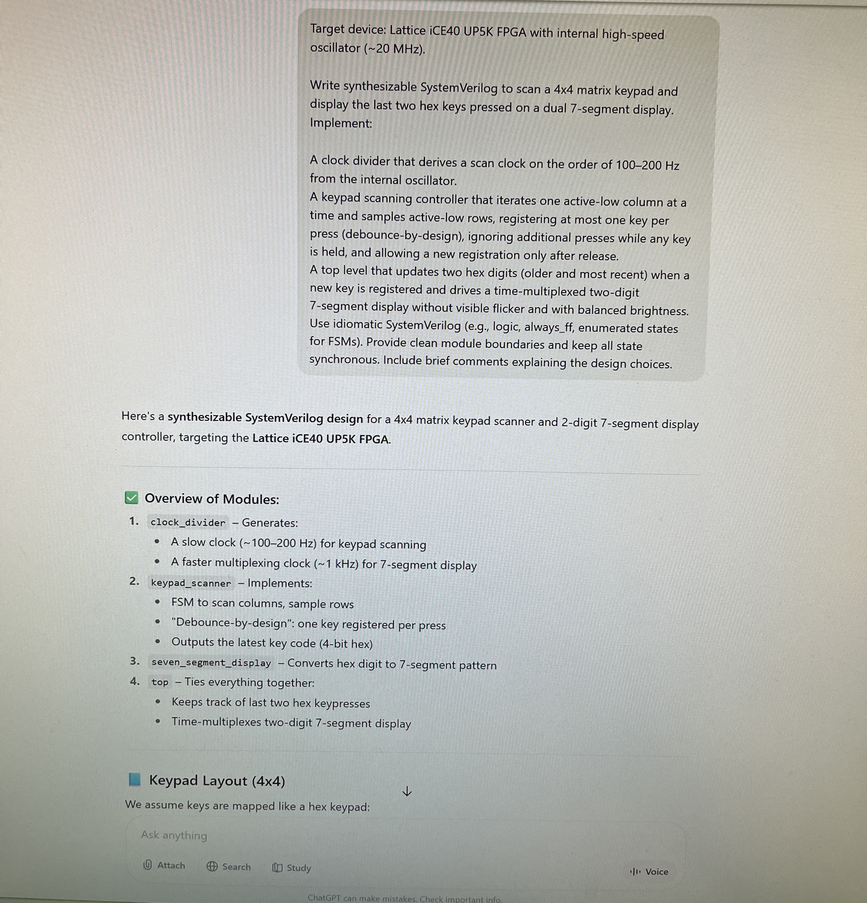 With the new prompt structure, ChatGPT implicitly called a seven segment display module that was stored in its memory from the first prompt. After pointing out this mistake and making ChatGPT rewrite its code, it fully compiled. While ChatGPT may have done this lab exponentially faster than me, it had more warnings (15) than me (11). I guess a little elbow grease was all the difference.
