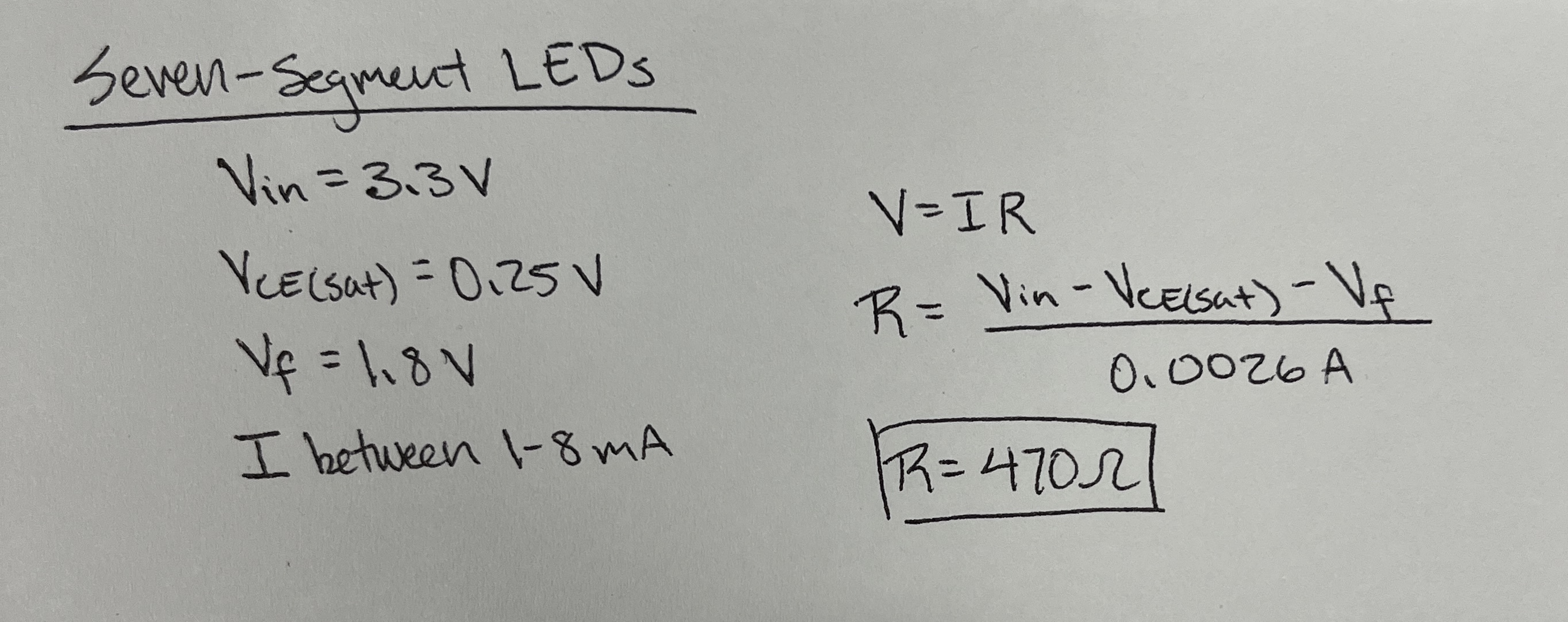 Like the last lab, the power for the dual seven-segment display is controlled with a 2N3906 PNP transistor that behaves as a switch. To preserve the FPGA’s GPIO pin functionality, the current sunk by the PNP base pin should be less than 8 mA. With a known 3.3 V emitter voltage, 0.7 V emitter to base voltage drop, and a desired current gain of 10, Ohms Law can be applied to determine the ideal resistor value.