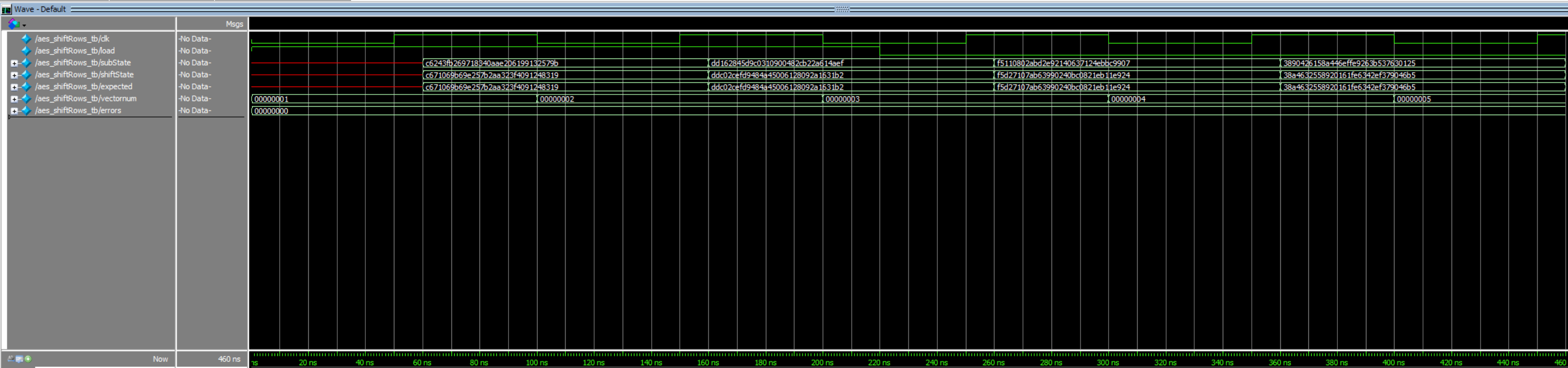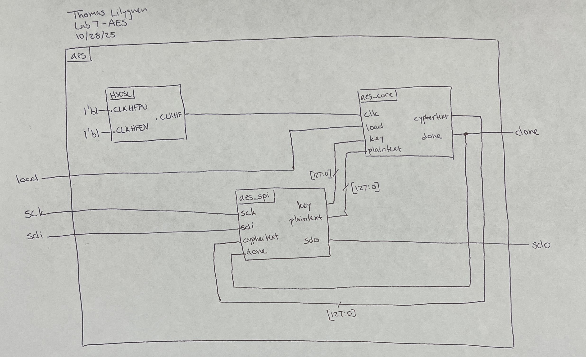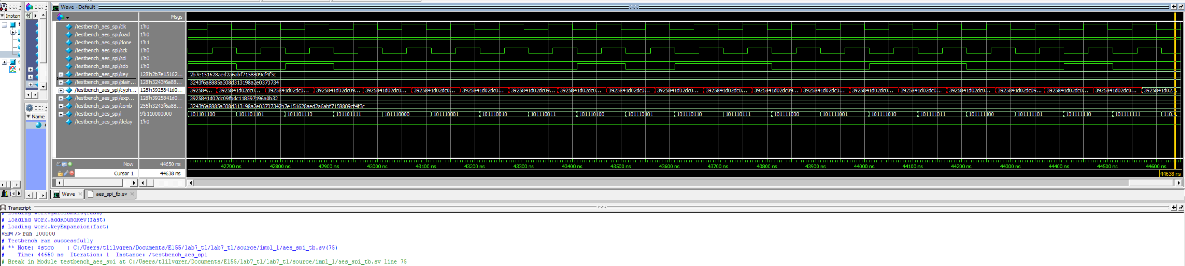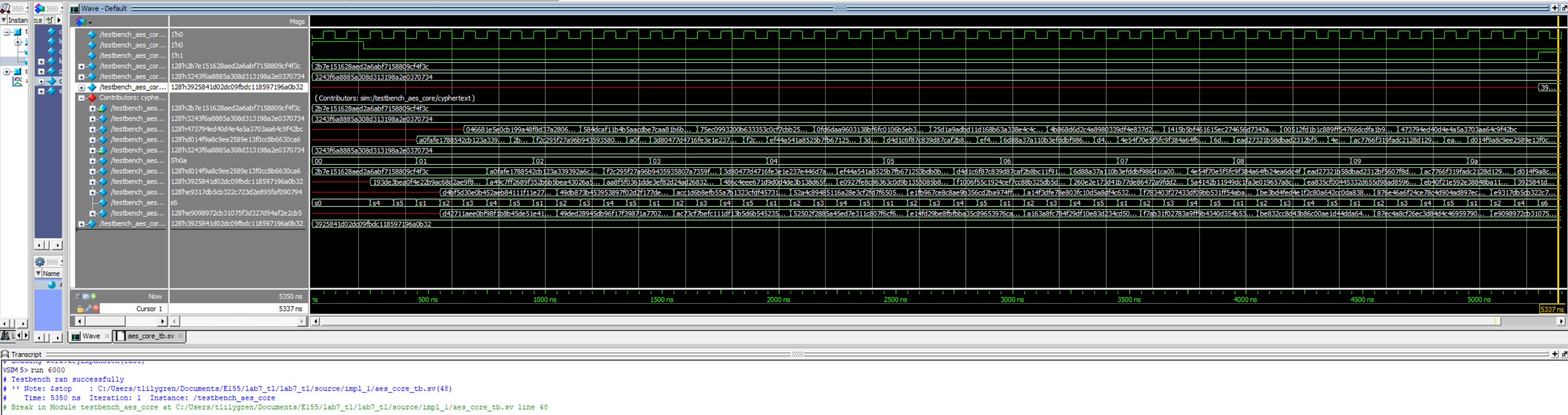 After roughly 20-25 productive working hours, this lab meets the listed specifications. The biggest challenge, besides wrapping my head around the lab conceptually, was modifying the aes_core module after running the simulation. The simulation allowed a design with many latches that would disrupt physical implementation. After accounting for these latches, the simulation was executed again and performed as desired.
