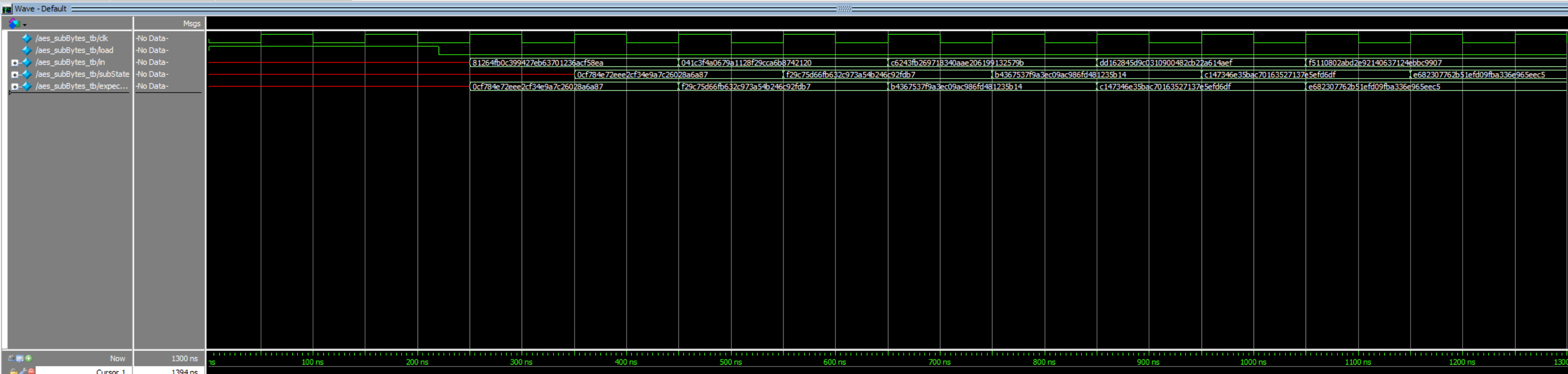 Independent waveforms for each module, and sub-module, by extension, prove proper behavior for the SPI encryption and general message encryption (Figures 4 and 5, respectively). The outputs from these primary aes modules were validated with examples provided in the FIPS 197 appendix, while the building-block modules’ results were validated with personal computation and bit-mapping (Figures 6 through 9). The physical success of this lab was confirmed by measuring the SPI communication with a logic analyzer on the Rigol oscilloscopes provided in lab. The communication patterns were confirmed to match those of the simulation waveforms, indicating that the AES accelerator did not exhaust all FPGA LUTs.