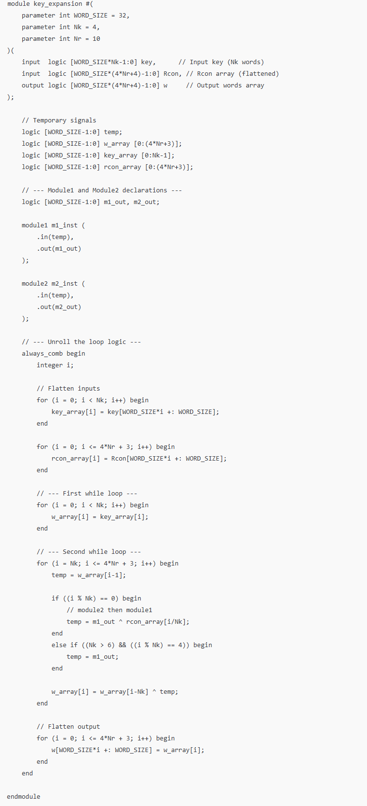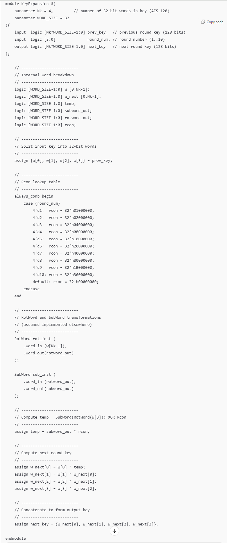 ChatGPT did relatively good job generating the key expansion code. Its use of parameters allows for modular implementation and enhances readability, decreasing the risk of error. The code synthesized properly, only after creating the modules that the prompt referenced. Its code was more readable overall and was separated into manageable sections that would help with debugging.